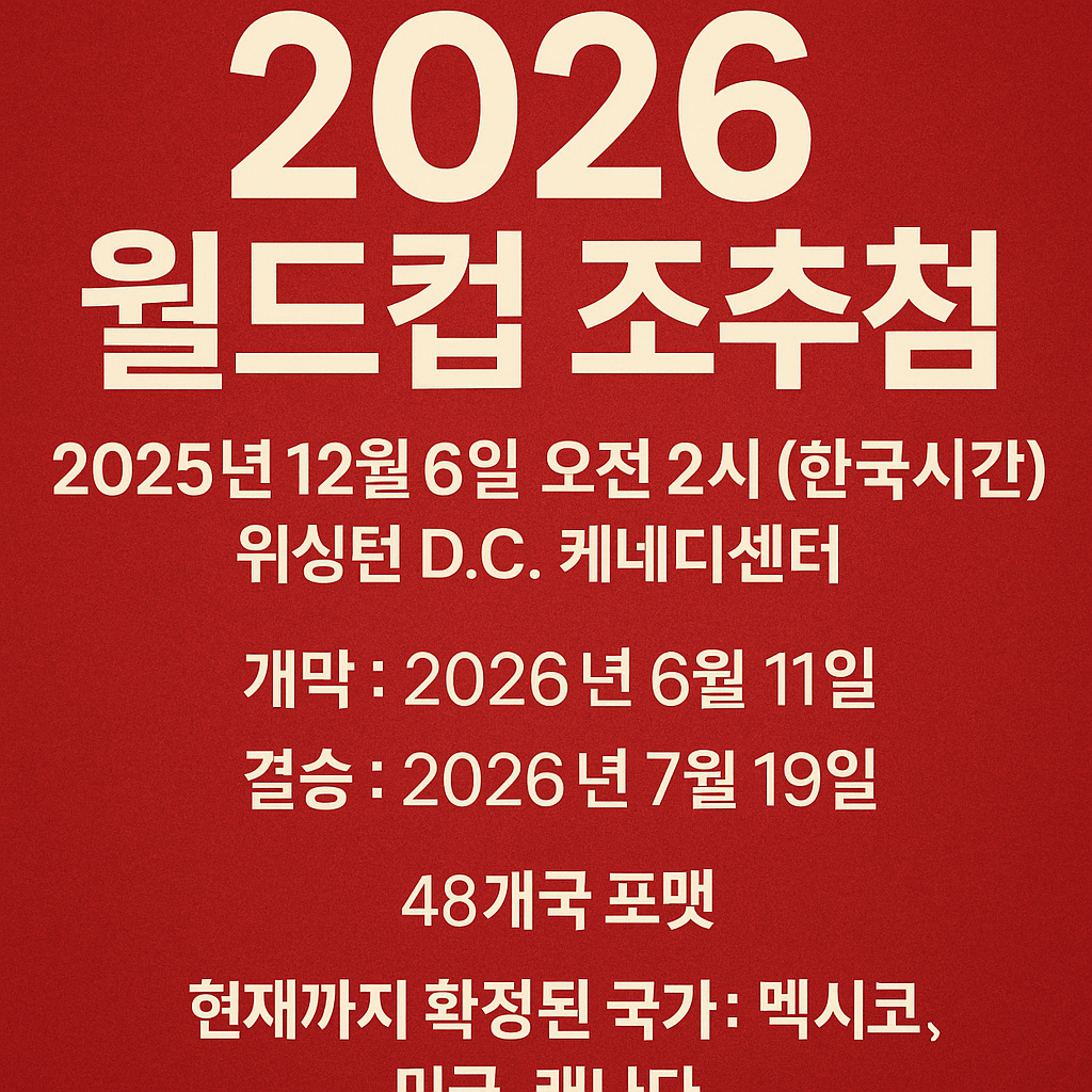 - 조추첨: 2025년 12월 5일(금) 12:00(미 동부) — 한국시간 12월 6일(토) 02:00 KST, 워싱턴 D.C. 케네디센터 개최.